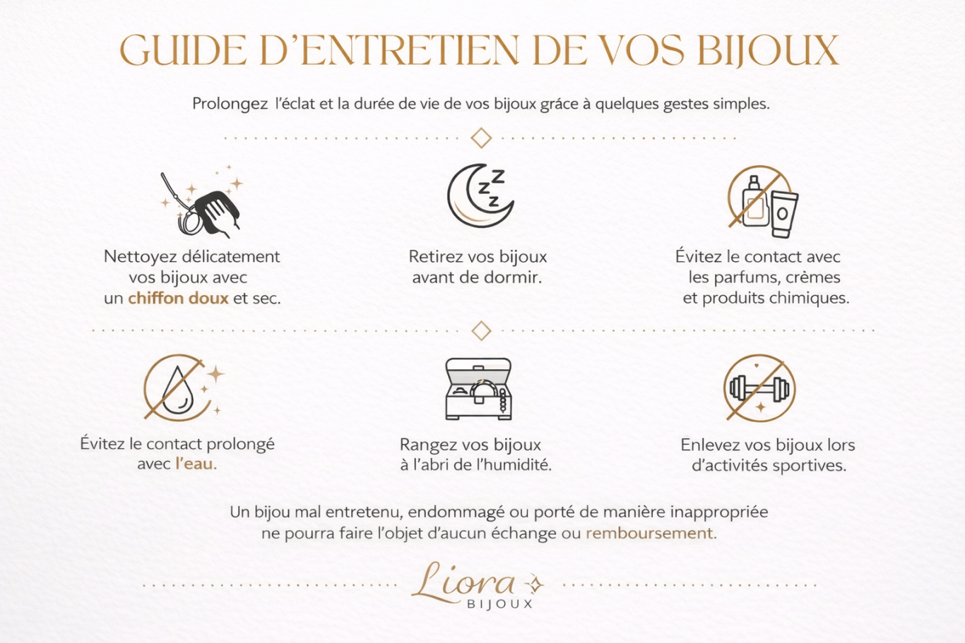 L’acheteur est seul responsable de l’utilisation, de l’entretien et de la conservation des bijoux après leur réception.
